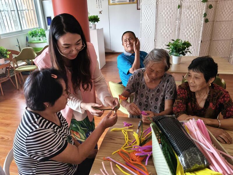 活动开始,老师们提前备好色彩鲜艳的扭扭棒、剪刀等材料,还特别邀请手工达人担任指导老师。考虑到部分老人初次接触扭扭棒手工,老师们首先向老人们介绍了扭扭棒折花的基本技巧和注意事项,手把手演示花瓣卷曲、花蕊固定、花茎缠绕等步骤。“大家不用急,扭扭棒柔韧性强,做错了也能调整,跟着我一步步来就行。”温柔的鼓励让老人们逐渐放下顾虑,纷纷拿起材料尝试。随后,在老师们和志愿者们的耐心指导下,老人们纷纷动手尝试。他们虽然动作略显迟缓,但眼神中却透露出专注和认真。