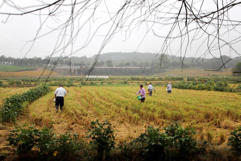 10月13日,高淳区桠溪国际慢城瑶宕村吕家田园驿站农田里,工人们采取人机结合的办法进行人工施肥和拖拉机翻耕田地。