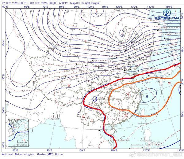 10月7日,副热带高压强得离谱,代表副热带高压的588线(图中红线)北界在甘肃南部至山东中部一带,592线(图中橙线)更是控制了福建、浙江、上海、江苏、安徽、湖北、湖南、江西等地。