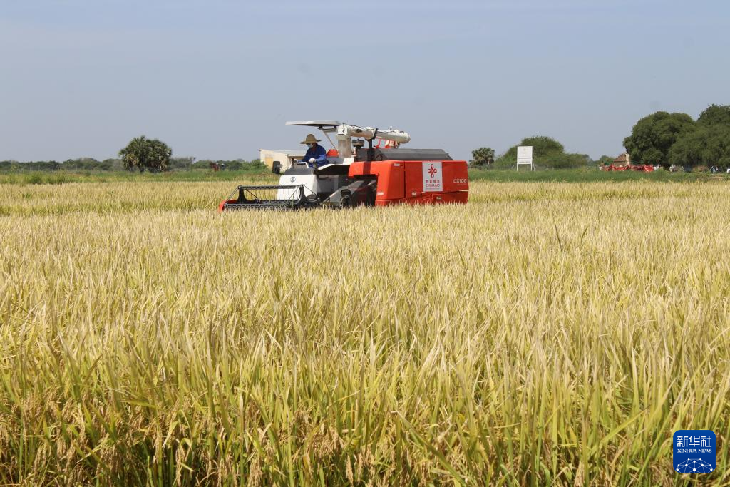 10月4日,在乍得哈杰尔-拉米斯省杜吉亚区米代金村,工作人员驾驶收割机收割水稻。新华社发(阿诺摄)