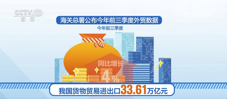 据海关统计,今年前三季度,我国货物贸易进出口33.61万亿元,同比增长4%。其中,出口19.95万亿元,同比增长7.1%,连续8个季度保持增长;进口13.66万亿元,同比下降0.2%,连续4个月增长。9月当月,进出口4.04万亿元,同比增长8%。