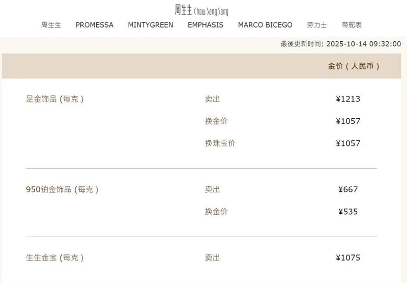 受国际金价影响,中国国内珠宝品牌足金首饰价格也出现上涨。14日,从已更新的情况来看,周生生足金饰品价格已涨至1213元/克。