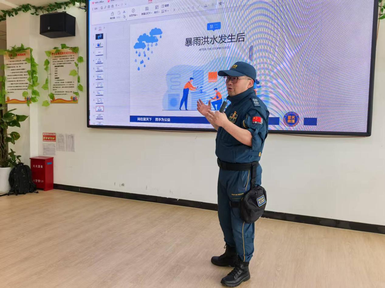 东坝街道消防站的专业志愿者详细介绍关于洪灾及城市内涝、防洪防雷等知识,并采取现场模拟互动的形式,让大家掌握暴雨洪水发生时自救、逃生的关键点。
