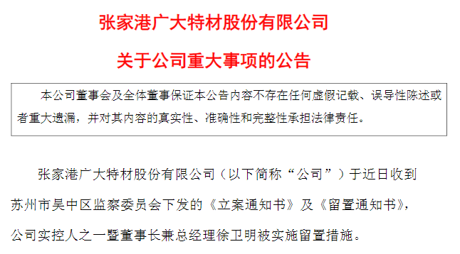 新华日报财经讯 10月14日下午,张家港广大特材股份有限公司(以下简称“广大特材”)发布公告,公司于近日收到苏州市吴中区监察委员会下发的《立案通知书》及《留置通知书》,公司实控人之一暨董事长兼总经理徐卫明被实施留置措施。