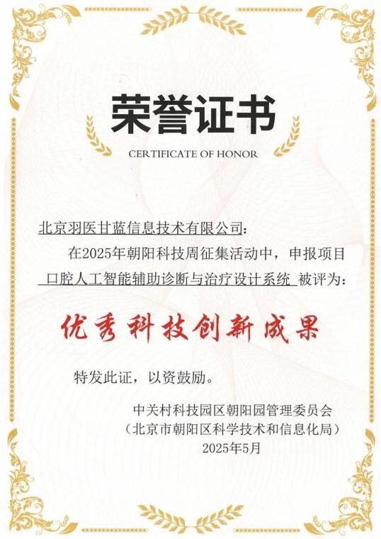 5月26日,2025年北京科技周启动活动——朝阳科技周开幕盛典在京举行。羽医甘蓝自主研发的“口腔人工智能辅助诊断与治疗设计系统”荣获优秀科技创新成果奖,这是对公司在数字医疗与口腔人工智能领域技术创新与引领能力的认可。未来,羽医甘蓝将继续以技术创新为驱动,聚焦临床需求,推动口腔医疗数字化转型与智能化升级,从朝阳走向世界,为全球伙伴提供更精准、高效、便捷的口腔人工智能解决方案。