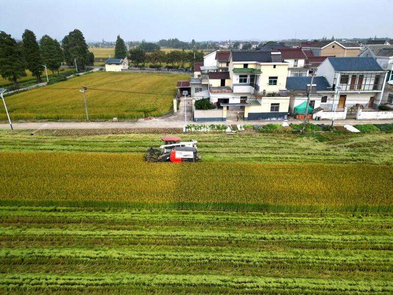 10月15日,在高淳区桠溪街道都市现代农业产业示范园内,收割机正在忙碌着收获水稻。