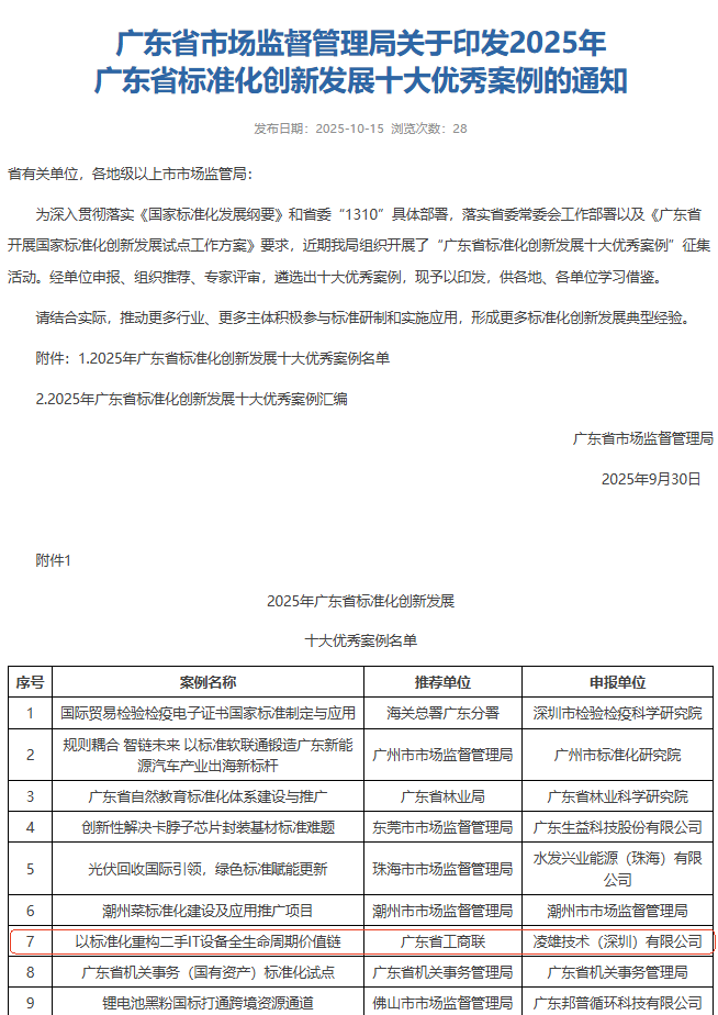 近日,广东省市场监督管理局公布了2025年“广东省标准化创新发展十大优秀案例”名单。凌雄技术(深圳)有限公司(凌雄科技全资子公司,简称“凌雄技术”)提报的案例《以标准化重构二手IT设备全生命周期价值链》(以下简称“案例”)成功入选,成为全省标准化创新实践的标杆之一。