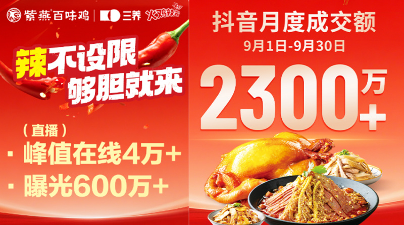 近日,紫燕百味鸡与三养食品的首次跨界专场直播圆满收官,以“辣不设限,够胆就来”为主题的联名活动引爆消费市场,直播间峰值在线突破4万+,曝光量超600万+。此举不仅深化了品牌年轻化形象,更直接推动了销售转化——2025年9月,紫燕百味鸡在抖音平台月度成交额突破2300万元,创下历史新高,为卤味行业品牌增长树立新标杆。