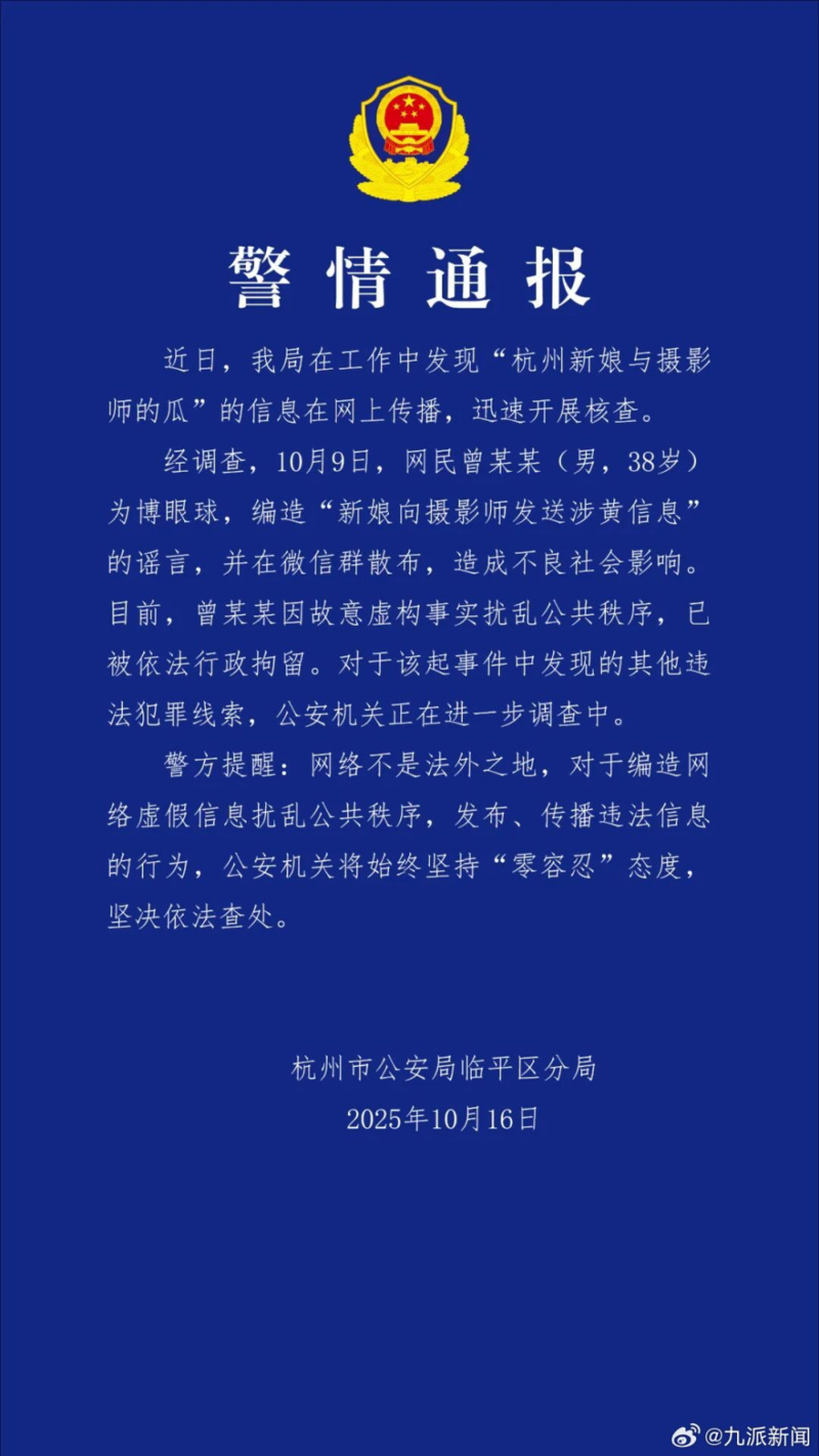 10月16日,杭州临平公安通报:近日,我局在工作中发现“杭州新娘与摄影师的瓜”的信息在网上传播,迅速开展核查。经调查,10月9日,网民曾某某(男,38岁)为博眼球,编造“新娘向摄影师发送涉黄信息”的谣言,并在微信群散布,造成不良社会影响。目前,曾某某因故意虚构事实扰乱公共秩序,已被依法行政拘留。对于该起事件中发现的其他违法犯罪线索,公安机关正在进一步调查中。