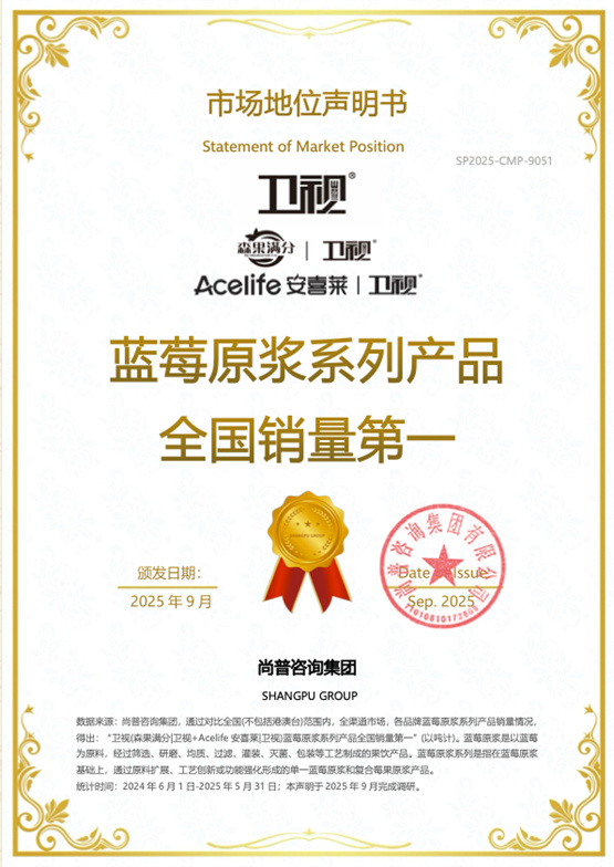 [1] 数据来源:尚普咨询集团,通过对比全国(不包括港澳台)范围内,全渠道市场,各品牌蓝莓原浆系列产品销量情况,得出:“卫视(森果满分|卫视+Acelife 安喜莱|卫视)蓝莓原浆系列产品全国销量第一”(以吨计)。蓝莓原浆是以蓝莓为原料,经过筛选、研磨、均质、过滤、灌装、灭菌、包装等工艺制成的果饮产品。蓝莓原浆系列是指在蓝莓原浆基础上,通过原料扩展,工艺创新或功能强化形成的单一蓝莓原浆和复合莓果原浆产品。统计时间:2024年6月1日-2025年5月31日;本声明于2025年9月完成调研。