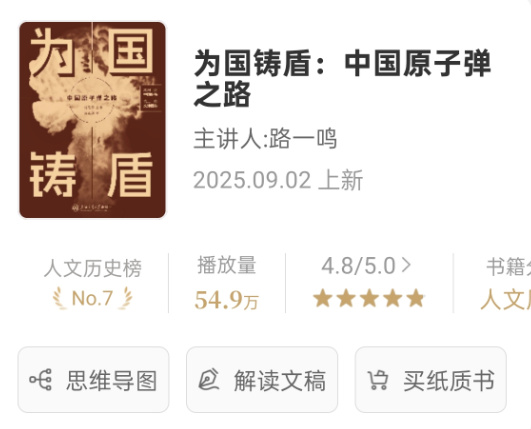 和平从来不能靠外人施舍,尊严要靠自己铸就。中国第一颗原子弹的研制之路,充满了艰辛与挑战。决策层高瞻远瞩的决策、科研工作者隐姓埋名的奉献、普通工人以命守护的担当、牧民寒冬迁徙毫无怨言的支持……无数人用热血与坚守,守护着祖国与人民的安全底线。在帆书APP非凡精读馆,听路一鸣老师解读《为国铸盾:中国原子弹之路》,全景式地了解中国第一颗原子弹研制的艰难历程,汲取吾辈自强的精神力量。