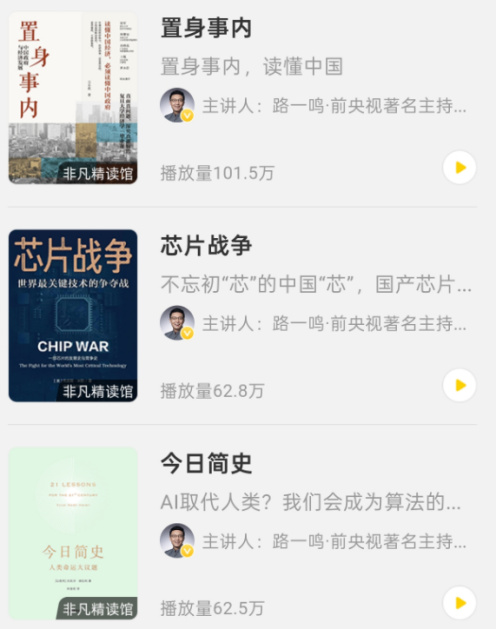 此外,在帆书APP非凡精读馆“读懂中国与世界:从历史脉络到科技博弈”书单中,还有《置身事内》《芯片战争》《今日简史》多本好书的解读,帮助用户多维度认知国家的发展。