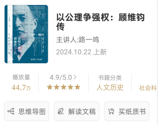 1919年巴黎和会上,顾维钧拒签不平等和约的一声“不”,是中国近代外交史上的高光时刻。但这本传记不止于个人故事,更是近代中国外交的缩影。在帆书非凡精读馆,路一鸣老师会讲述顾维钧在巴黎和会上拒签不平等条约的经过,让我们深刻感受到当时中国外交的艰难与无奈,以及顾维钧等外交家为了国家尊严所做出的努力。通过他的解读,我们不仅能了解近代著名外交家顾维钧的一生,更能走近以公理争强权的中国近代外交史,明白和平的来之不易,以及国家强大对于保障人民幸福的重要性。