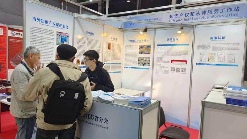 展会现场,一个以淡蓝色为主色调的展位格外引人注目——这是江苏省贸促会“知识产权和法律服务工作站”。