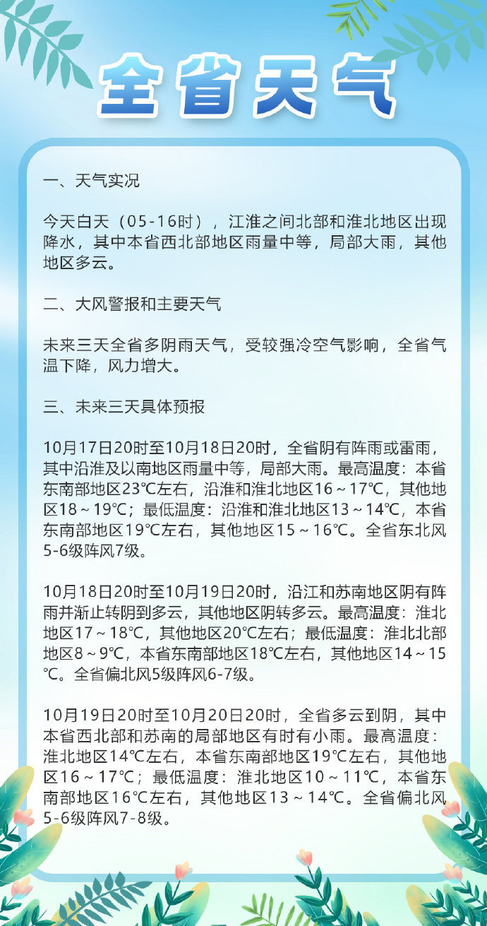 10月17日20时至10月18日20时,全省阴有阵雨或雷雨,其中沿淮及以南地区雨量中等,局部大雨。最高温度:本省东南部地区23℃左右,沿淮和淮北地区16~17℃,其他地区18~19℃;最低温度:沿淮和淮北地区13~14℃,本省东南部地区19℃左右,其他地区15~16℃。全省东北风5-6级阵风7级。