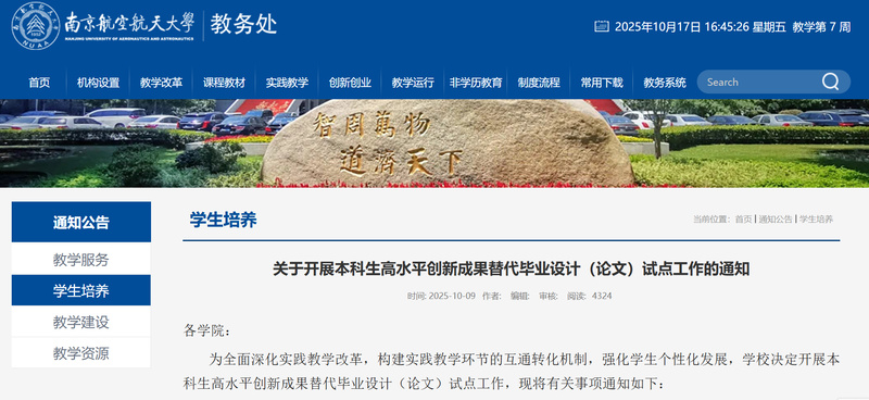 本科毕业不用写论文了?近日,南京航空航天大学发布的《关于开展本科生高水平创新成果替代毕业设计(论文)试点工作的通知》引发全网热议,不少网友将其解读为“毕业门槛降低”。但记者深入梳理政策细节后发现,这条“免写论文”的新通道,实则并非降低难度,反而对本科生创新能力提出了更高、更全面的要求。