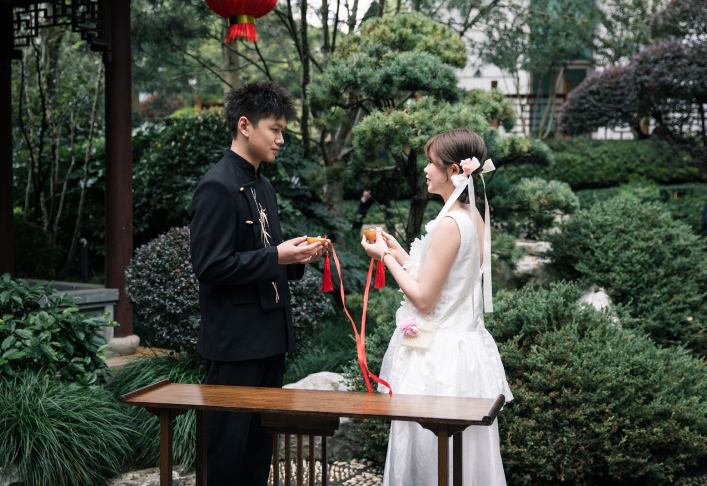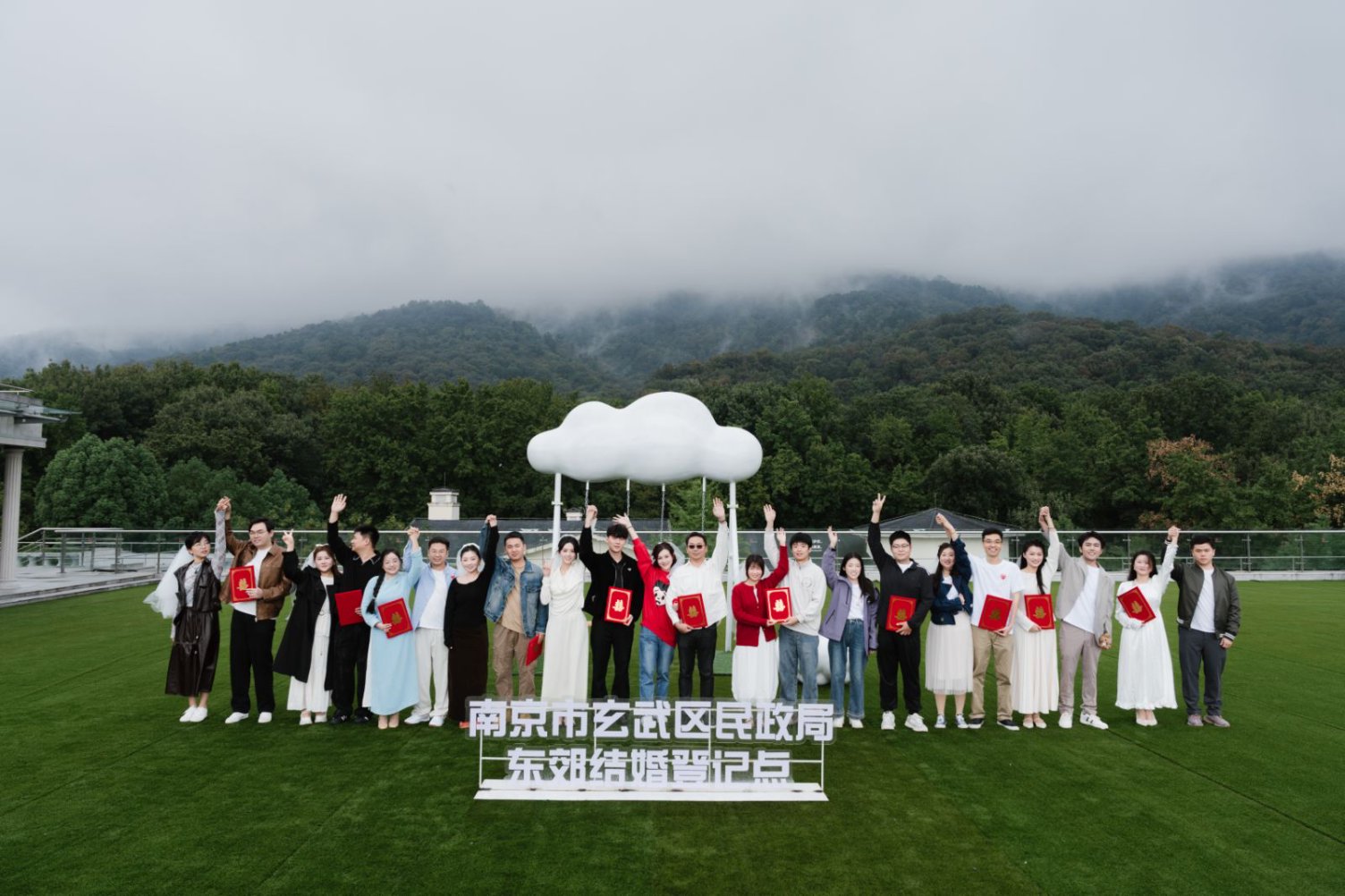 跨鞍祈福、锦囊传情、合卺交杯、共签婚书……10余对来自各行各业、有着不同家庭背景的新人代表在青山绿水环绕中完成神圣的领证仪式。他们在百年连理树下并肩而立,定格幸福瞬间;在云朵秋千上紧握双手,让笑声与微风共舞;在同心桥上系同心锁,将“执子之手”的约定慎重安放;在紫气东来亭的红绸花影里,动情诉说相爱的誓言;在欣对厅的亭台水榭间,体验中式婚礼的雅致韵味;在“金陵胜迹”雕砖壁画前,将无尽的喜悦之情融进古今交换的金陵美景中,拉开了一生甜蜜喜悦的篇章。