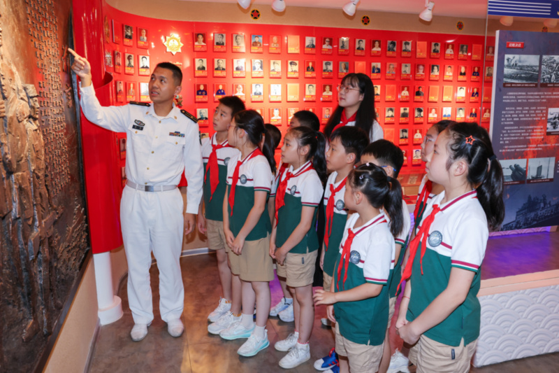 在庄重的仪式环节,少先队员代表为海军叔叔献上鲜花,并佩戴上鲜艳的红领巾。浪花白与红领巾的交相辉映,象征着崇尚英雄、学习榜样的种子在队员们心中深深扎根。队员们用庄严的队礼,向守护万里海疆的人民海军表达最崇高的敬意。