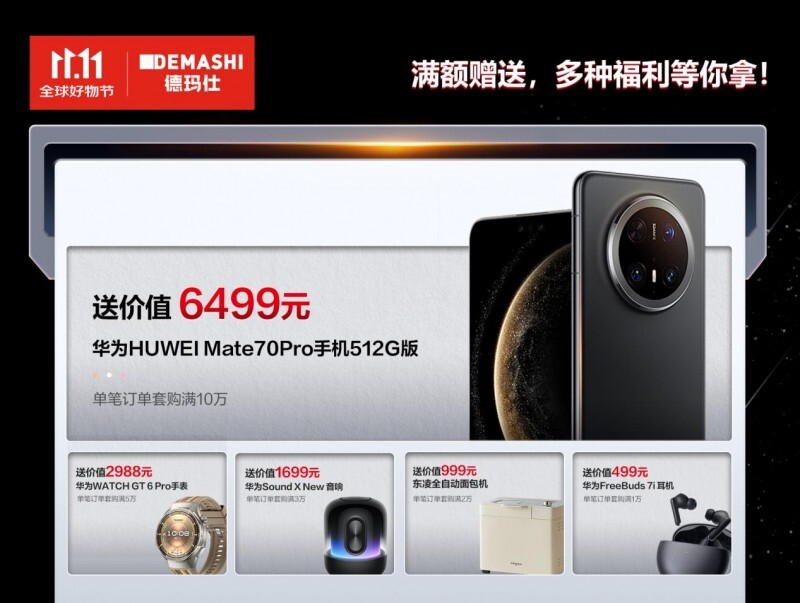 活动期间,每满额一档,即解锁一重科技好礼!订单实付满10000元,即送价值499元华为FreeBuds 7i耳机;实付满20000元,即送价值999元东凌全自动面包机;实付满30000元,即送价值1699元华为Sound X New智能音响;实付满50000元,即送价值2988元华为WATCH GT 6 Pro智能手表;实付金额突破100000元,更是直接赠送价值6499元华为HUAWEI Mate 70 Pro手机!