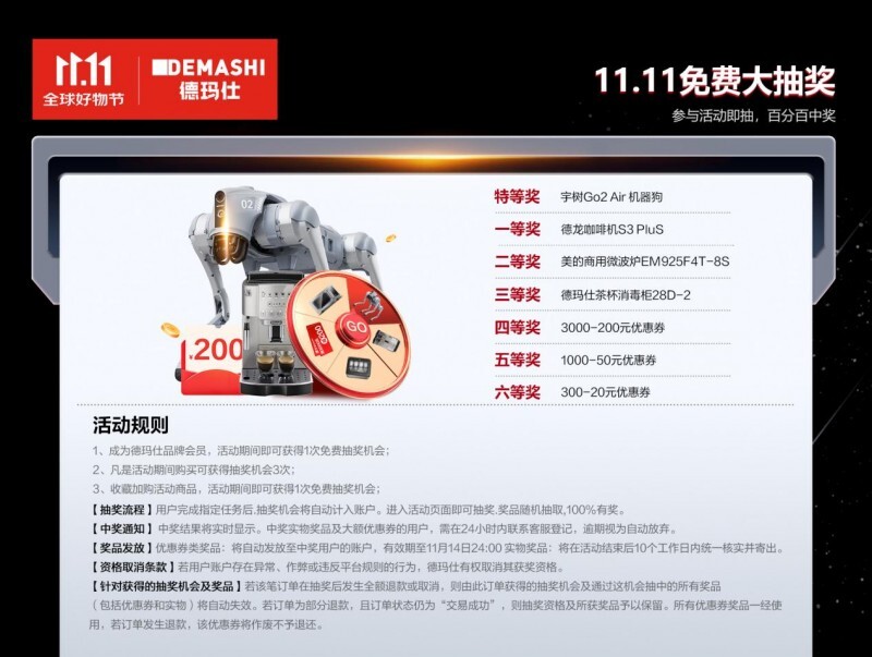 成为德玛仕品牌会员/活动期间购买/收藏加购活动商品,活动期间满足任一条件,即可获得1至3次抽奖机会!宇树Go2 Air机器狗、德龙咖啡机、美的商用电磁炉、德玛仕茶杯消毒柜等惊喜好礼等你抱走!