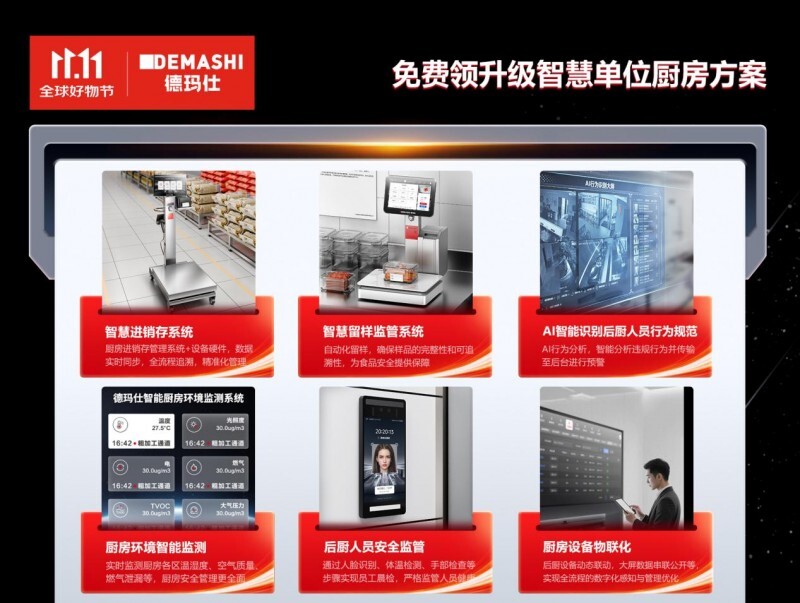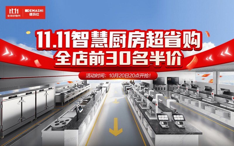 德玛仕坚持以用户需求为核心,拒绝虚假噱头,诚意推出覆盖价格、互动与服务的全维度福利,真正实现“真优惠、真实惠”!全店前30名半价、满额赠豪礼、免费抽大奖、免费咨询升级单位智慧厨房方案,更有单位智慧厨房11.11专属套装超大力度优惠等您解锁!