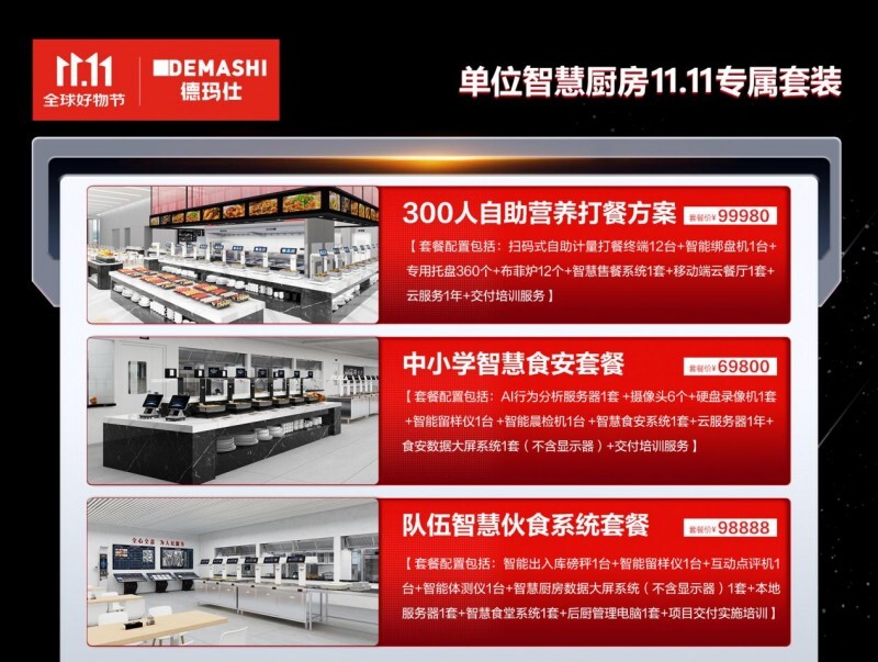 德玛仕11.11专属智慧厨房套装,下单即享9折钜惠,立省预算!300人自助营养打餐方案狂欢价99980元;中小学智慧食安套餐狂欢价69800元;队伍智慧伙食系统套餐狂欢价98888元!开箱即用,一次投入,长期受益!
