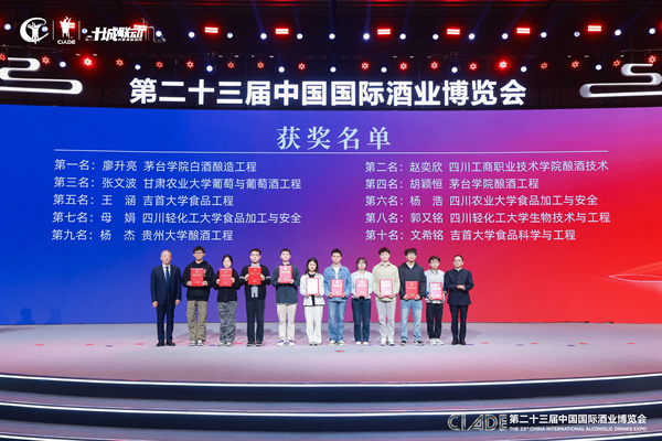 最终脱颖而出的前十名选手,获邀出席10月17日举办的第二十三届中国国际酒业博览会开幕式,并将在现场接受了中国酒业协会理事长宋书玉以及茅台集团党委书记、董事长张德芹的表彰。此外,大赛还为预赛筹备与组织工作表现突出的赛区,颁发“优秀单位组织奖”以资鼓励。