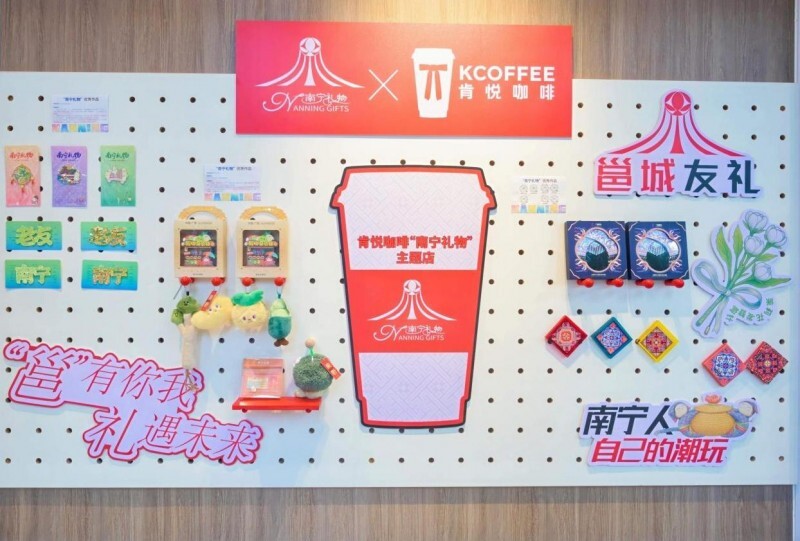 步入店内,一场沉浸式的城市文化之旅随即展开。最为引人注目的是精心打造的“南宁礼物展示区”,墙上不仅展陈了往届“南宁礼物”评选出的优选文创商品、特色摆件与装饰品,其灵活可调的模块化设计,本身也象征着一种不断更新、充满活力的城市文化姿态,展现出民族文化的美妙设计。另一面“南普文化墙”则充满了本地生活气息,将南宁方言与品牌元素趣味结合,诸如“南宁礼物‘肯’定威水”、“我的咖啡搞掂没”、“肯悦咖啡做的飞法法”等句子,让本地市民会心一笑,也让外地游客直观地感受到南宁这座城市的语言魅力。