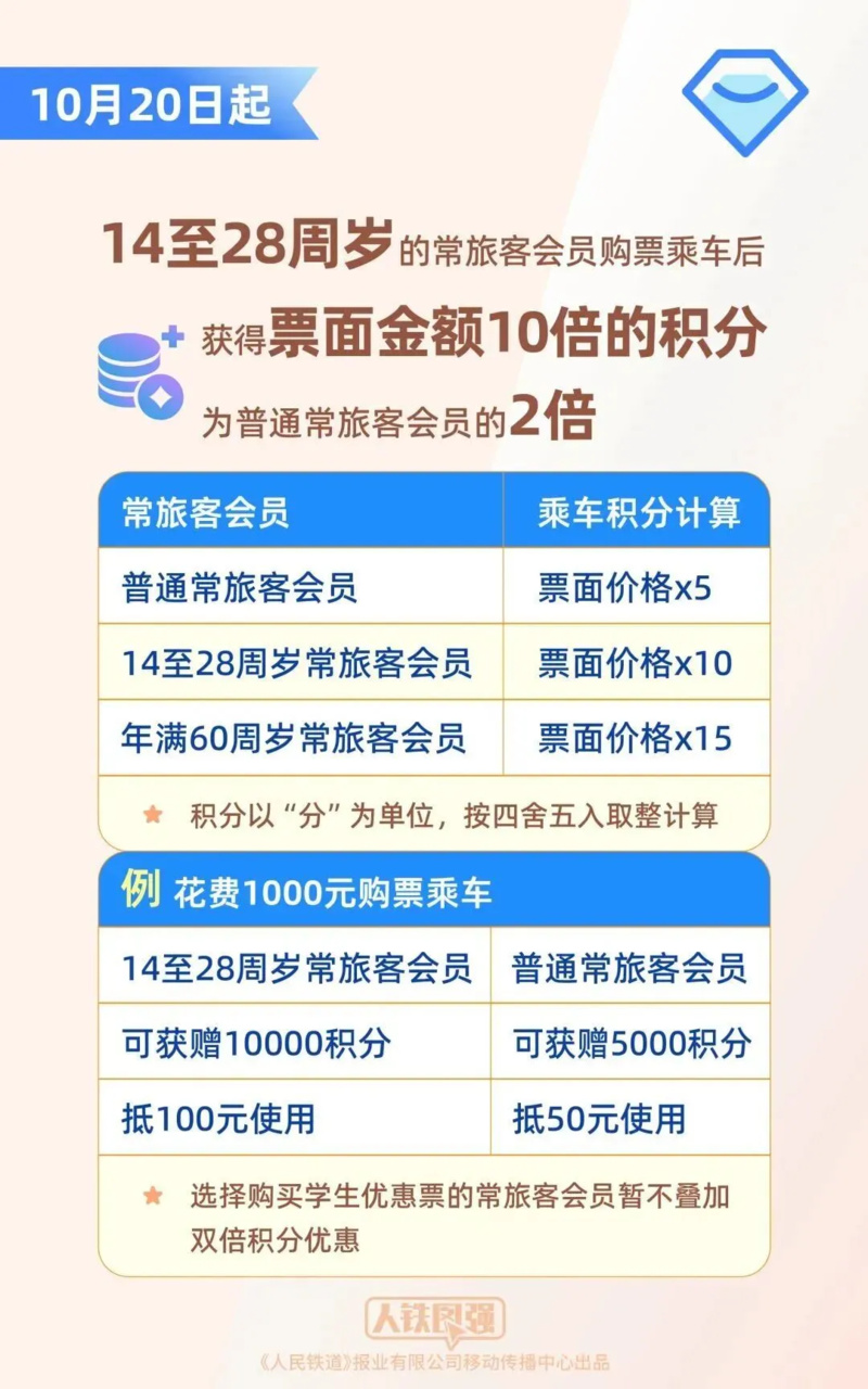 10月20日起,14至28周岁的常旅客会员购票乘车后将获得票面金额10倍的积分,为普通常旅客会员的两倍,即普通常旅客会员花费1000元购票乘车,可获赠5000积分、抵50元使用;