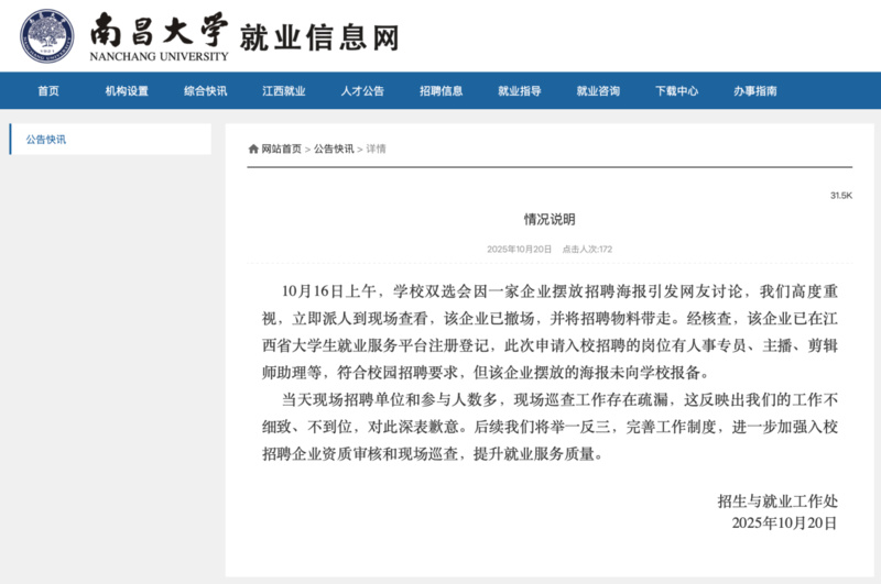 说明称,10月16日上午,南昌大学双选会因一家企业摆放招聘海报引发网友讨论,学校高度重视,立即派人到现场查看,该企业已撤场,并将招聘物料带走。