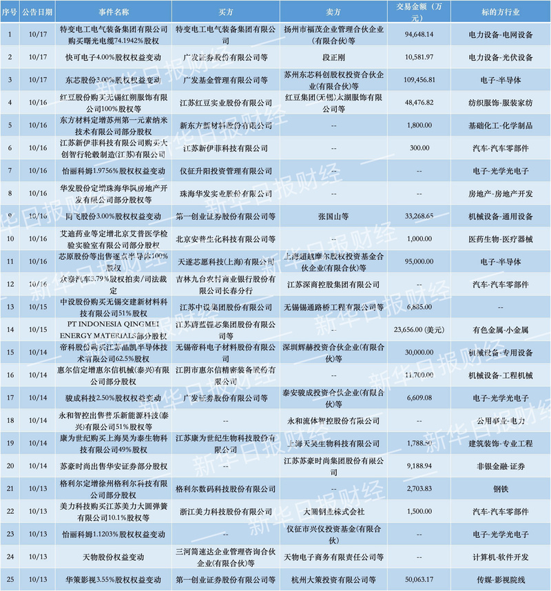 新华日报财经讯 本周(2025年10月13日—10月19日)并购亮点速览: