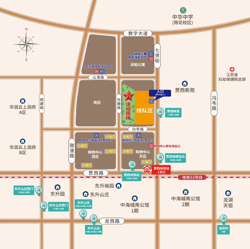 1、乘地铁S3号线,至贾西站下车1号口出,步行300米到达。