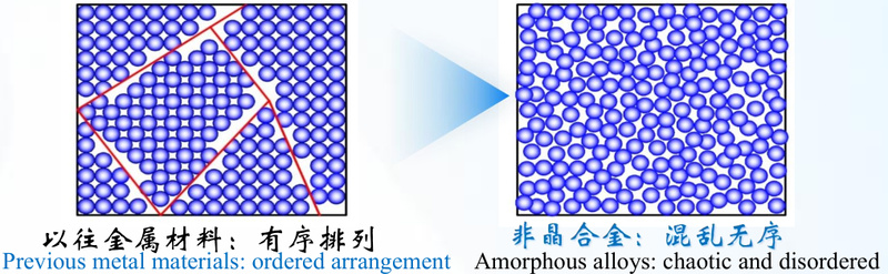 在微观世界的战场上,传统金属原子如同训练有素的士兵,以严整的晶格方阵构筑钢铁长城。而非晶合金的原子却像一场自由即兴的街头艺术——没有固定队形,没有重复图案,只有随机的舞蹈轨迹,这种结构被称为“长程无序”,即使使用最先进的电子显微镜观察,在微小到仅有数个纳米的范围内,也无法找到一个重复的原子排列模式。原子就像被“冻结”在液态时的随机状态,没有晶体那样的周期性平移对称性。这种长程无序结构,正是其化身“六边形战士”的终极密码: