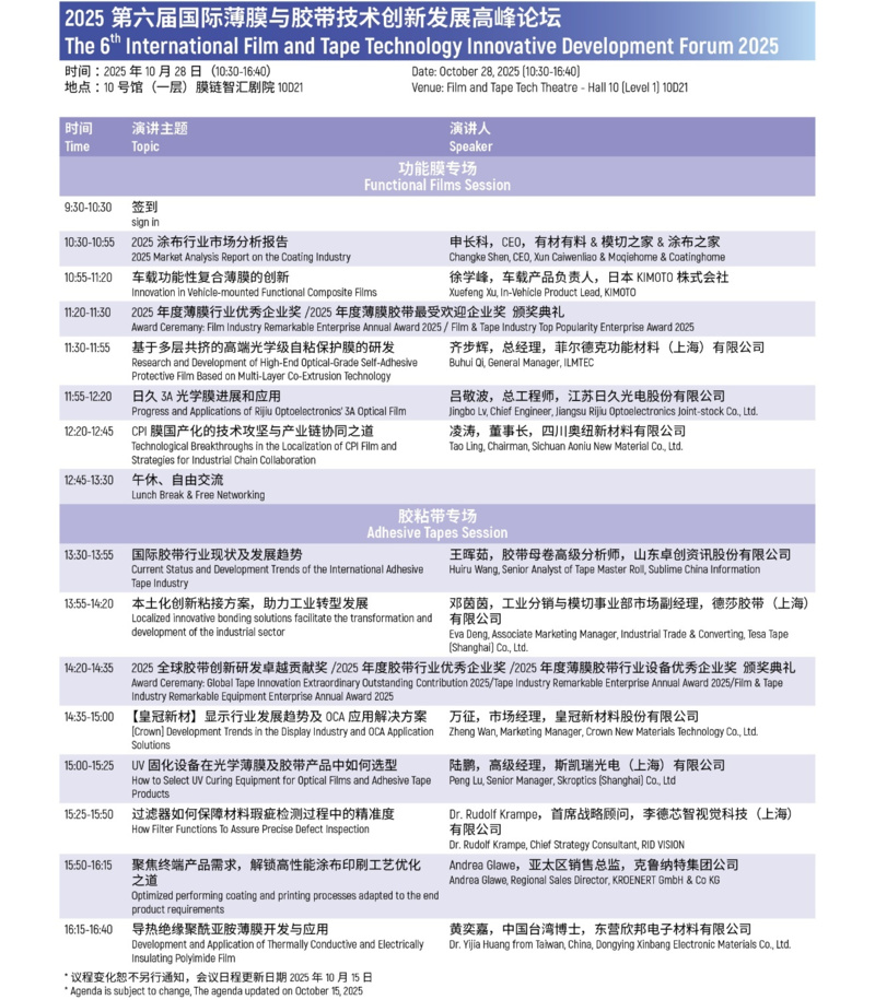为助力行业人士把握产业发展脉搏,本届展会同期将举办 6 场高规格专业论坛,邀请海内外行业专家、企业领袖、科研机构代表等共同参与,围绕薄膜与胶带产业的技术创新、市场趋势、政策解读、应用拓展等核心议题展开深入探讨,为行业发展提供智力支持与方向指引。