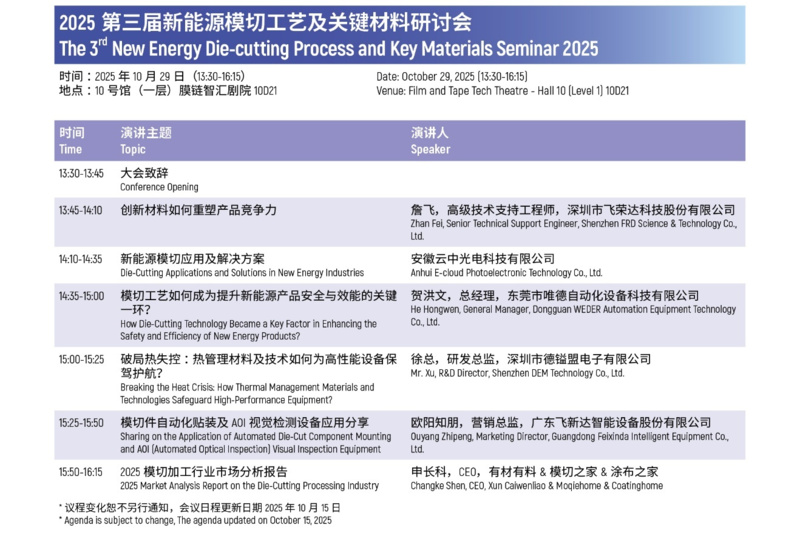 2025 第三届新能源模切工艺及关键材料研讨会:聚焦新能源等领域的模切工艺技术创新与关键材料应用,分享模切工艺优化方案与材料选型经验,提升新能源模切产品的质量与性能。
