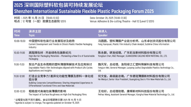 2025 深圳国际塑料软包装可持续发展论坛:围绕塑料软包装行业的绿色可持续发展主题,探讨中国塑料软包装行业发展现场及趋势、可降解包装材料的研发与应用、低碳生产工艺等热点问题,助力包装行业实现 “双碳” 目标。