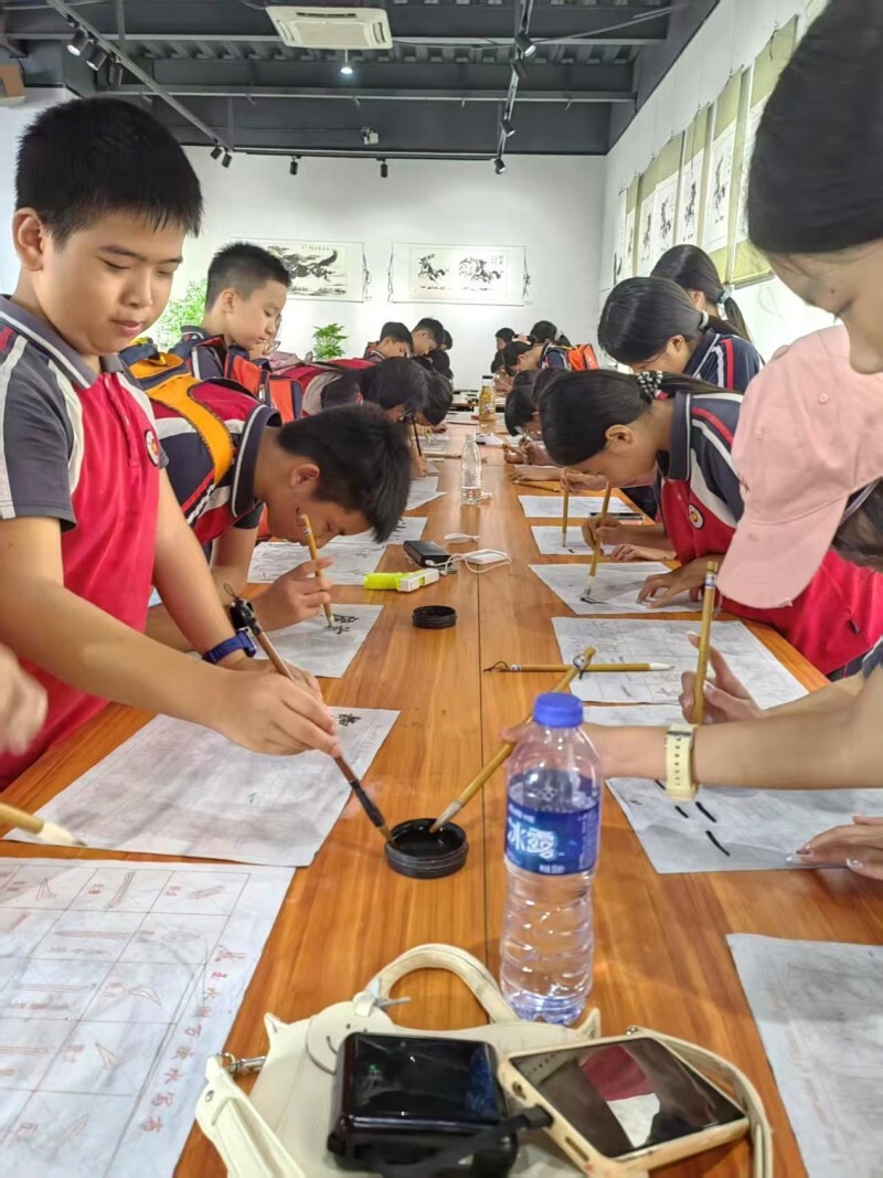 展厅中央的长木桌,是孩子们的“创作阵地”。毛笔、宣纸、墨碟整整齐齐摆着,空气里飘着淡淡的墨香,惹得孩子们一个个直吸鼻子。五年级的晓冉第一次拿毛笔,手指捏得紧紧的,墨汁蘸多了,“啪嗒”一声滴在宣纸上,晕开个黑团团。她慌了神,眼圈都有点红,旁边的指导老师赶紧拿过笔,手腕轻轻一转,黑团竟真的变成了马腹的轮廓。晓冉眼睛瞪得溜圆,赶紧学着老师的样子,歪歪扭扭地画马腿。等她把画举起来给同学看时,嘴角都要咧到耳朵根了,墨汁沾了满手也顾不上擦。