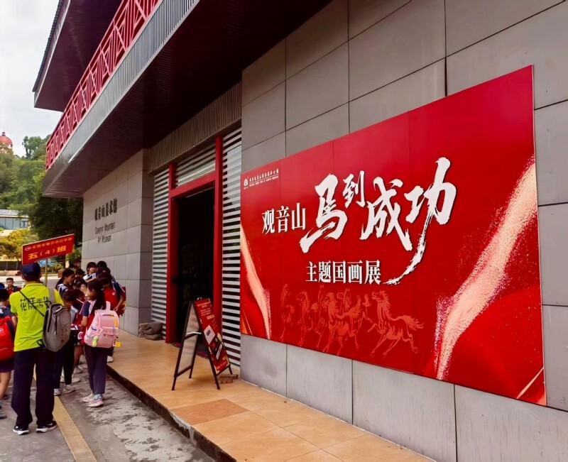 观音山的绿,是能溢出来的那种——92%的森林覆盖率,把整座山裹成一块翡翠。可就在这片浓绿深处,观音山美术馆像个惊喜的彩蛋:站在美术馆门口,灰色的建筑墙面上,“马到成功主题国画展”的红色巨幅海报格外打眼。奔马的剪影在金粉似的纹理里若隐若现,几个孩子仰着脑袋,手指戳着海报上的马,脆生生喊:“老师你看!这马好像要从牌子里跑出来了!”带队老师笑着拍拍孩子的肩,声音里带着笑意:“进去看,真马比这还神!”