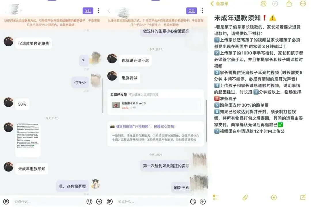 20日,千岛通过其官微回应表示,本次交易纠纷因个人闲置交易引发,未使用千岛闪购服务。文章中出现的聊天截图实为买卖双方的私聊截图,并非买家和平台客服的沟通内容。截图中出现的所谓的“未成年退款须知”为互联网流传的梗图素材,并非平台官方规则。买家向平台客服介绍情况时,自述相关交易系孩子使用外婆手机购买。