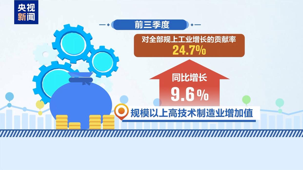 中国电子信息产业发展研究院工业经济研究所副所长 韩建飞:前三季度还有一个明显特征,就是新旧动能转换加快。一方面,传统产业通过技术改造和创新驱动,正在焕发新的生机,生物基材料制造、核燃料加工等细分领域均实现两位数增长。另一方面,新质生产力增长潜能持续释放,特别是汽车、电气机械、电子行业表现突出,三个行业对全部工业增长的贡献率合计接近40%,新质生产力已成为推动工业经济稳增长的重要力量。