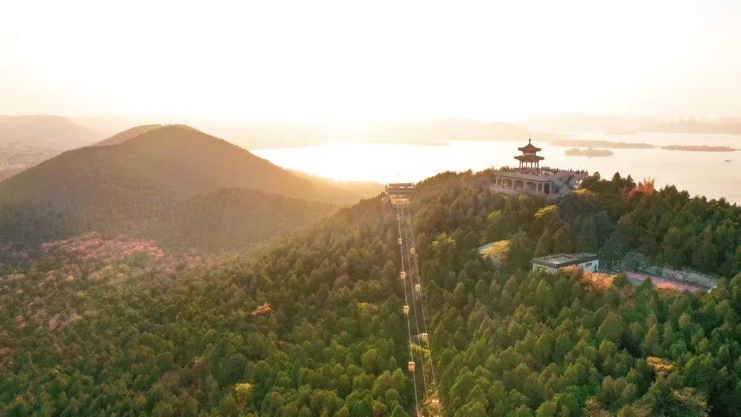 自观景台一侧乘观光索道而下,为领略云龙湖胜景提供了独特视角。缆车缓缓穿行于林海之上,约一刻钟的行程里,沿途景致如画卷般徐徐展开。起初是脚下蓊郁的山林绵延起伏,继而云龙湖的粼粼波光跃入眼帘。远望处,现代城市轮廓与自然山水交相辉映,完美诠释了徐州“一城青山半城湖”的独特城市风貌。