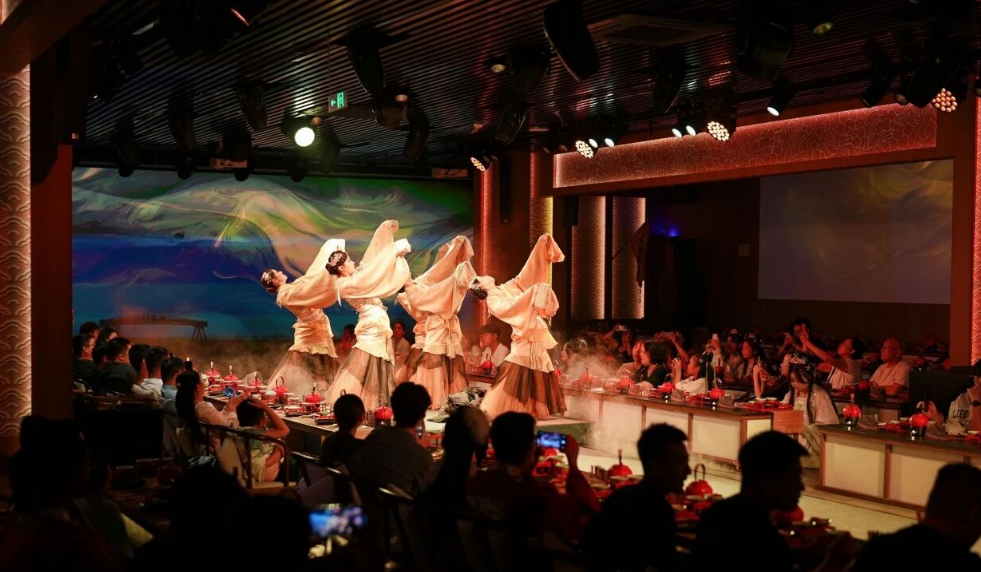 作为南京首个全方位“文旅+”多业态融合项目,这家以明文化为背景的沉浸式餐秀自去年开业以来,凭借“一菜一故事,一宴一礼乐”的独特体验频频登上热搜。“今年下半年更新室内场景后几乎场场爆满,不少游客提前两周都订不到位。”王珣提供的客流量数据统计显示,其今年国庆中秋假期的数据格外亮眼,上座率超过九成,客流量同比增长20%左右。穿汉服、看乐舞、品佳肴,游客在这里不只是吃饭,更能沉浸式感受金陵文脉。