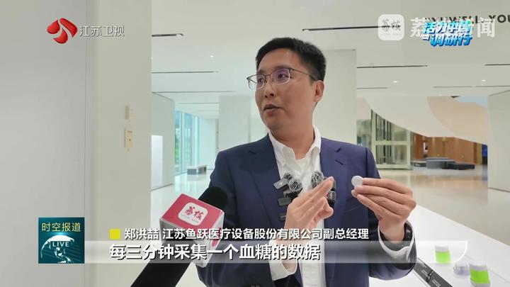 江苏鱼跃医疗设备股份有限公司副总经理郑洪喆说:“背后有一个传感器,可以看到这个柔性的电极。我们通过前面的注针器将该电极埋入到皮下,通过这里面的电子部分每三分钟采集血糖的数据,通过蓝牙传输到手机APP,也就是这个设备可以完整追溯用户这16天血糖的波动。”