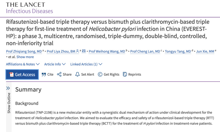 北京大学第三医院消化科周丽雅、宋志强教授团队带领全国40家医疗机构消化疾病诊疗中心,通过全球首个Ⅲ期临床试验,证实了含利福特尼唑的三联方案,比临床上常用的铋剂四联方案具有更高的根除成功率和更低的不良反应发生率,而且用药更少,服用更方便,将为全球幽门螺杆菌感染者带来了全新的治疗选择。相关成果日前于《柳叶刀-感染病学》在线发表。