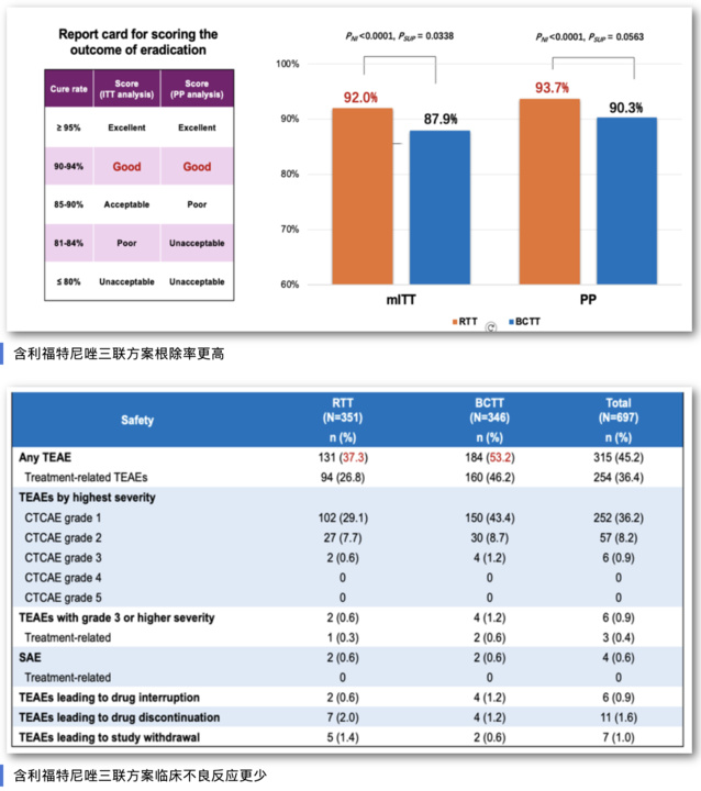 这项在中国开展的多中心、随机、双盲、阳性对照研究,纳入700例幽门螺杆菌感染初治患者。宋志强介绍,利福特尼唑是我国自主研发的全球首创新型分子实体药物,专门针对幽门螺杆菌感染研发。相关基础和临床研究结果均显示,幽门螺杆菌对该药物普遍敏感,最小抑菌浓度低,有效克服幽门螺杆菌高耐药问题,而且表现出良好的安全性。