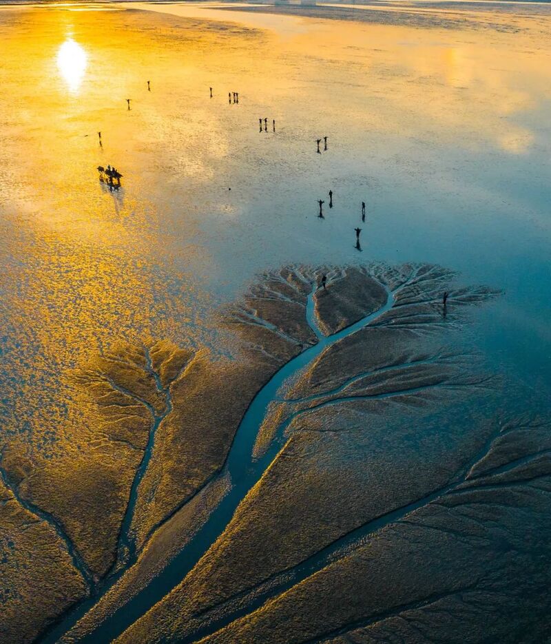 若将长江比作一条巨龙,圆陀角便是巨龙入海前最后的回眸。圆陀角是中国广袤土地上唯一能同时揽怀长江、黄海与东海的神奇之地。这里三水激荡,江海交融,共同孕育出广袤无垠的湿地与得天独厚的自然风光。当退去的潮水在金箔般的滩涂上作画,勾勒出枝桠分明的“潮汐树”。启东是江苏最早看到日出的地方,而位于最东端的圆陀角则是最先受到晨曦“眷顾”的圣地,因此每年元旦跨年时,不少年轻人都会选择在此看新年日出。