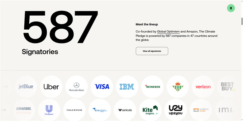 截至目前,已有包括IBM、VISA、奔驰、Uber等在内的587家全球顶尖企业加入TCP,共同承诺在2040年实现净零排放——这一目标比《巴黎协定》设定的2050年提前了整整10年,展现了亚马逊在可持续发展领域的雄心壮志。