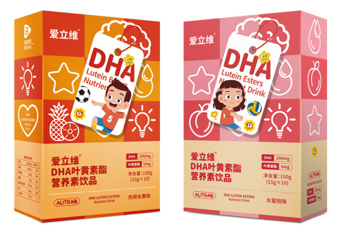 【创新乳液剂型】 爱立维DHA叶黄素酯饮品 ,采用创新乳液剂型,并有水蜜桃、热带水果两种口味,天然果香无腥味,宝宝爱吃。