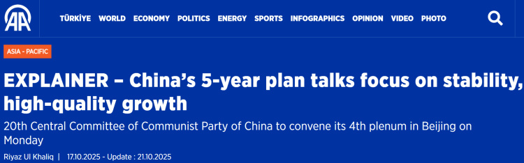 土耳其阿纳多卢通讯社援引分析人士的话表示,此次中国共产党二十届四中全会正值全球动荡且不稳定的背景之下举行,会议讨论的内容至关重要,五年规划对于中国经济的发展方向与目标设定具有重要意义。