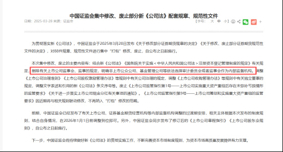 今年3月,证监会发布配套规定,要求上市公司应当在2026年1月1日前,按照有关规定,在公司章程中规定在董事会中设审计委员会,行使公司法规定的监事会职权,不设监事会或者监事。